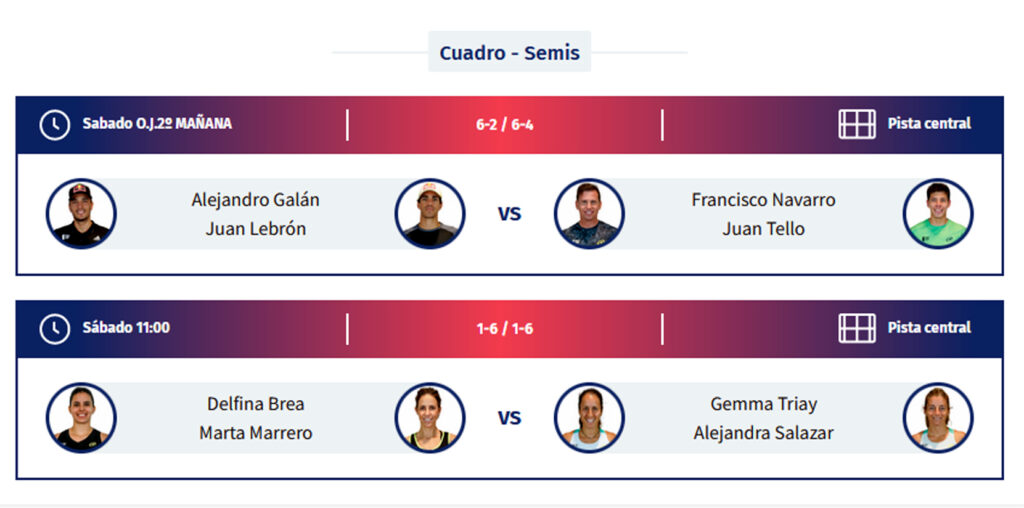 Durante la mañana de este sabado ,horario de Argentina,se disputaron los primeros encuentros de semifinales que determinaron los primeros finalistas tanto en damas como en caballeros,aún falta que se dispute la otra llave en horas de la tarde.Nuestra Delfi Brea se pierde la final ya que no pudieron superar junto a su compañera Marta Marrero a la dupla Gemma Triay y Alejandra Salazar ya que estas ultimas se quedaron con el paso a finales por 6-1 y 6-1 .