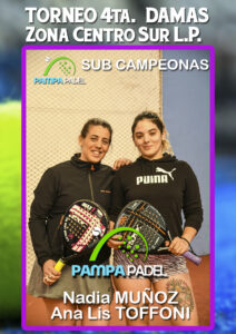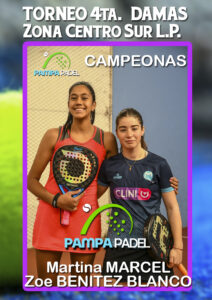 En la ciudad de Santa Rosa se disputó la última fecha del torneo de Cuarta categoría damas en las instalaciones del complejo Médanos Verdes.La pareja que a la postre se quedó con el título es la integrada por Martina MARCEL y Zoe BENITEZ BLANCO que en la final se impusieron a Nadia MUÑOZ y Ana Lis TOFFONI por 7/5 y 7/5 en un apasionante partido.