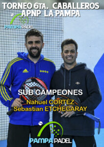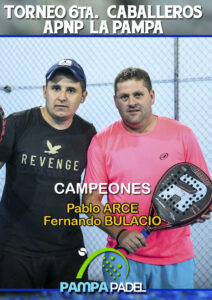 En las instalaciones del predio Los Médanos de General Pico se jugó durante el fin de semana un torneo de 6ta. categoría de APNP. Los campeones resultaron Pablo Arce y Fernando Bulacio quienes vencieron en la final a Nahuel Cortéz y Sebastian Etchegaray por 6/7 , 6/4 y 6/4. Las instancias de semifinales las disputaron la dupla Arce y Bulacio ante Rubén Godoy y Thomas Malvicino a quienes derrotaron por 7/6 y 6/3 y en la otra llave Cortéz- Etchegaray vencieron a Germán Manzato y Rafael Quiroga por 7/6 y 6/3.-